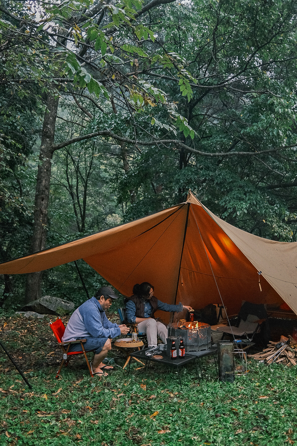 햇살이 강한 날에는 앞문 두 장을 분리하여 작은 타프처럼 활용할 수 있어 그늘 아래에서 여유로운 휴식을 즐길 수 있습니다.